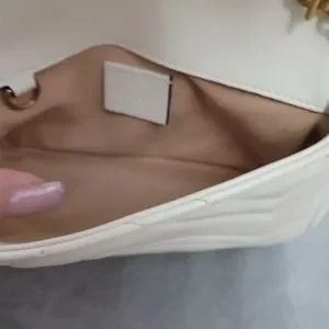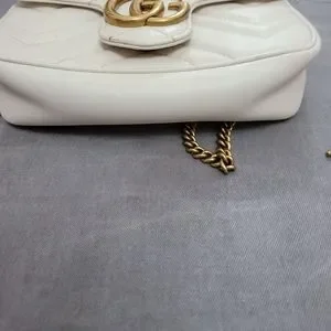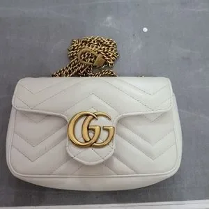 Elegant white leather crossbody bag. Features iconic gold Gucci logo. Stylish chain strap.