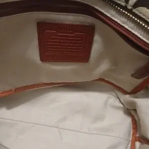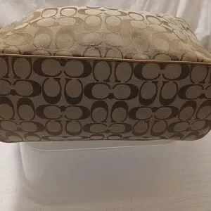 Stylish and spacious brown & tan tote bag; classic Coach with signature C's design. Perfect for everyday use.