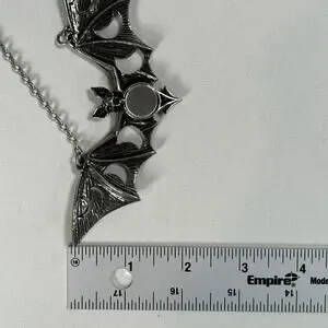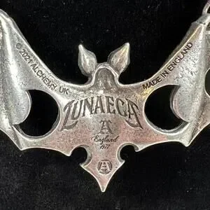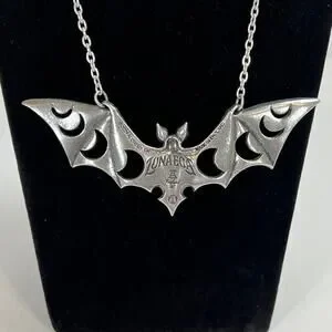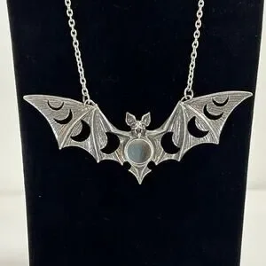 A large (almost 5" wide) vampire bat shaped necklace with the phases of the moon cut out of the wings and an inlaid mirror "full moon" center piece. Made in England from fine English pewter. Awesome gothic and wiccan necklace.