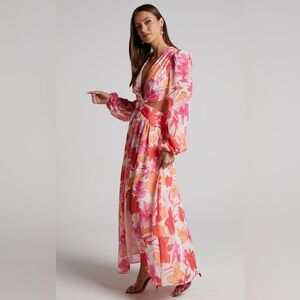 Showpo EMILEE MIDI DRESS Side Cut Out Long Sleeve Plunge Dress in Pink Floral 8