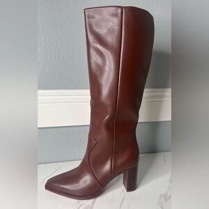 Elevate your wardrobe with these elegant knee-high leather brown boots. Crafted for style and comfort, they are perfect for any occasion. Made of faux leather. Side zipper for comfortable wear