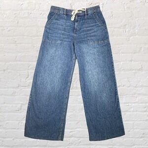 Lucky Brand Wide Leg Patch Pocket Pull On Jeans in Size Women's Large or 34" x 31". An effortlessly cool, relaxed wide leg jean, this pull-on pair has an on-trend drawstring waist, patch pocket styling and raw edge hems for a laid-back look.