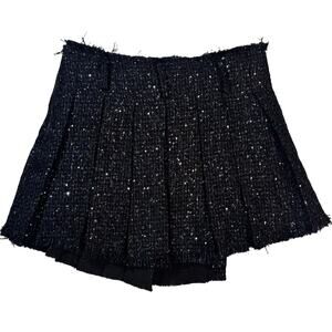 Black sequin tweed asymmetric pleated mini skirt with faux wrap button detail, side zip closure, frayed trim hem, lined interior, Bloomingdale’s exclusive Aqua x Wicked collaboration piece inspired by cinematic costume design, holiday glam, partywear, statement sparkle, dark academia luxe.