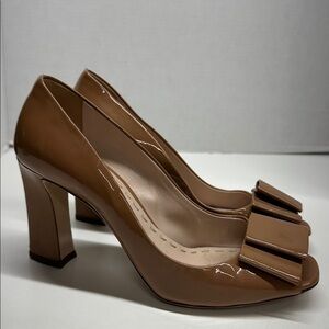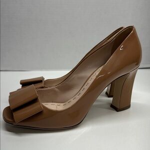 Miu Miu Heels Open Toe Patent Leather Bow Block Heel Tan Brown Size 38.5 US 8.5