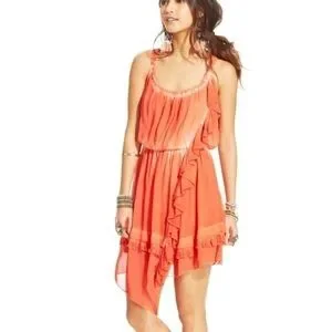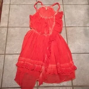 Free People Aphrodite Tie Dye Dress in orange. Tie dye coloring adds vibrant flair to a flirty boho dress adorned in asymmetrical ruffles that draw the eye to a sheer off kilter hemline. The elastic waist secures the floaty silhouette. Excellent condition. Slip overhead and go. Fully lined. 100% Viscose. Machine washable cold, line or lay flat to dry. Great summer dress. Smoke free home. Lay flat measurements are approximately