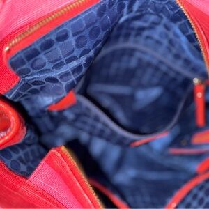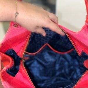 The Kate Spade Jubilee Stevie Striped Bag is a medium-sized bag with a width of 14 inches, a height of 9.5 inches, and a depth of 6.5 inches. It has a vintage style and beautiful silky interior. This shoulder bag is perfect for any occasion, whether it's for travel, casual outings, or workwear. The bag features pink handles, embossed Kate Spade logo bottom, top a zip closure and interior pockets for easy organization. The exterior is made of red and pink striped fabric, while the interior is lined with blue fabric.