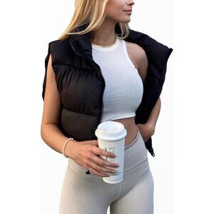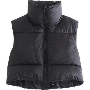 Women's Black Fashion High Neck Zipper Cropped Puffer Vest Jacket Coat Cardigan