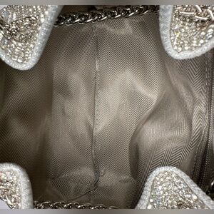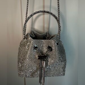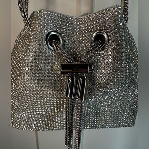Silver rhinestone crystal bucket bag with chain strap — perfect for holiday parties, Christmas events, and New Year’s Eve. Sparkly glam statement purse with drawstring closure and crystal top handle. Excellent condition and ready to shine ✨