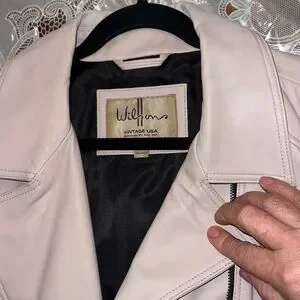 Stylish light pink leather jacket by Vintage. Features sleek zipper details and a classic design.