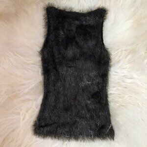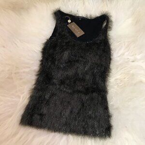 Gunmetal Gucci sleeveless knit top with fringe accents throughout and scoop neck.