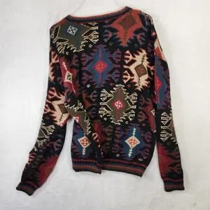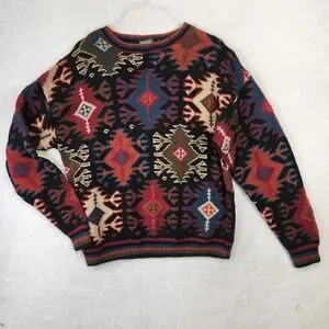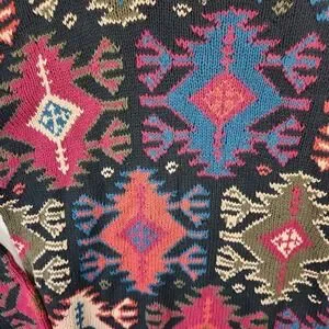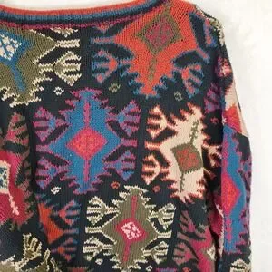 Vintage Hammacher Schlemmer hand-knit sweater featuring an allover Southwestern / Aztec geometric pattern in multicolor on black. Heavyweight 100% cotton knit with ribbed collar, cuffs, and hem. Premium heritage catalog brand known for quality goods. Strong 90s boho / desert core aesthetic—great statement piece for fall layering.