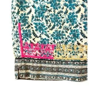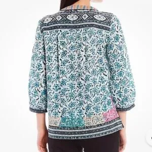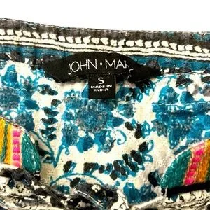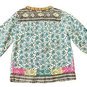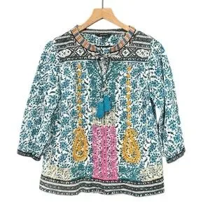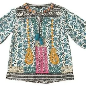 This top is a John Mark embroidered boho peasant tunic, characterized by its multi-pattern floral print in turquoise, black, white, pink, and yellow. It features 3/4 sleeves, a split V-neckline with tassel ties, and intricate placed embroidery detailing along the front and collar