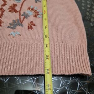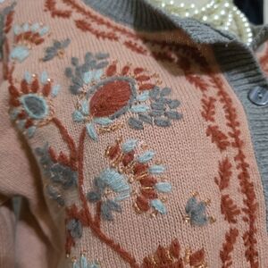 This elegant floral embroidered sweater features a charming button-up design. The soft pink and gray colors add a touch of sophistication to any outfit. Perfect for staying stylish and cozy.