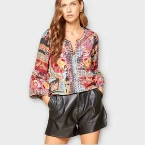 A relaxed-fit pullover tunic with a split V-neckline and 3/4-length bell sleeves. Features an allover mixed print with vibrant floral embroidery on the front and sleeves