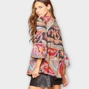 Savanna Jane Boho Floral Embroidered Paisley Bell Sleeve Black Top Small