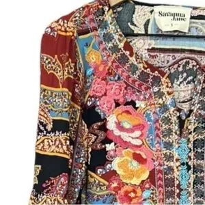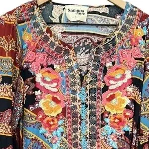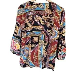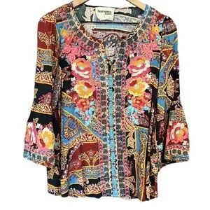 Savanna Jane Boho Floral Embroidered Paisley Bell Sleeve Black Top Size Small