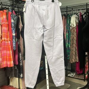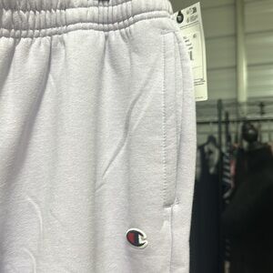 The color of these is mourning due. It’s like a lilac lavender color. Please be sure to look it up if you’re not sure on the champion website by that color. Drawstring elastic waist two front pockets and they are cropped at the bottom.