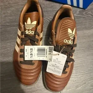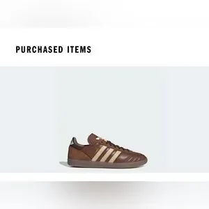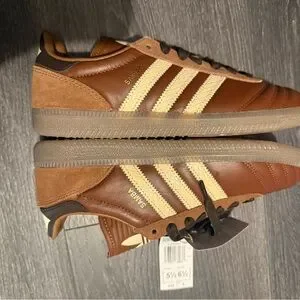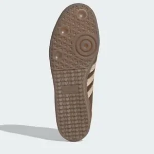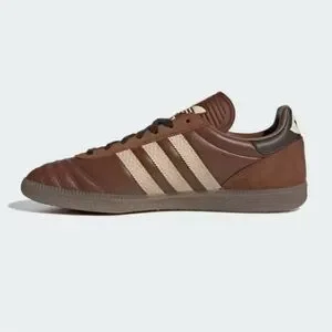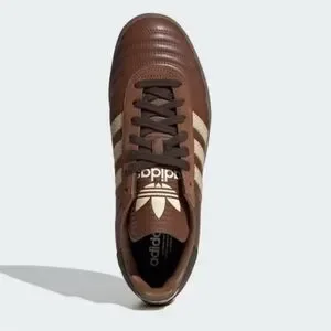Stylish brown sneakers with cream stripes. Classic adidas Originals design. Comfortable and versatile.