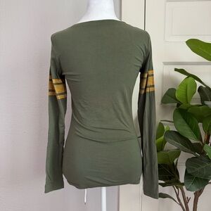 This fitted jersey by 47 highlights the Green Bay Packers' signature green and gold colors. The long sleeves are adorned with striking gold stripes, enhancing the sporty look of the soft, stretchy fabric. Ideal for fans, this top merges comfort with team pride.