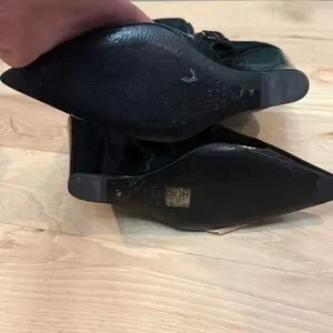 Chic black patent leather wedges. Sleek design with a modern edge. Ideal for stylish outings.