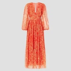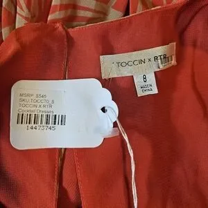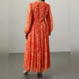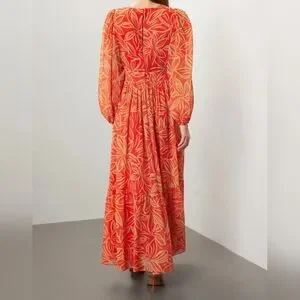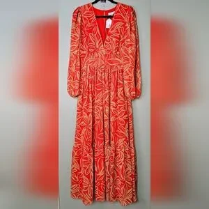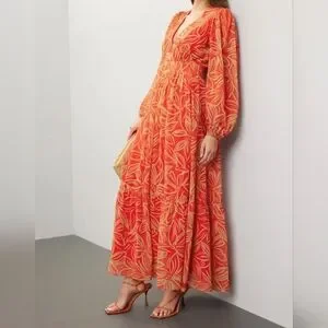 This vibrant TOCCIN x RTR maxi dress features a bold reddish orange and tan leaf print, perfect for making a statement at any summer event. Pair with simple sandals and minimal jewelry to let the dress shine. Size 8