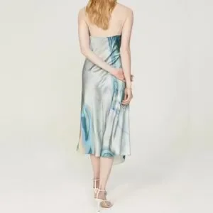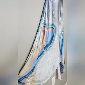 Blue printed satin (97% Polyester, 3% Spandex). Slip. Sleeveless. Cowl neck. Back zipper closure. Imported.