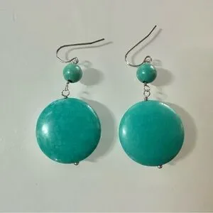 Design: Each earring consists of a smaller round bead connected to a larger, flat, circular disc, both in the same turquoise hue.