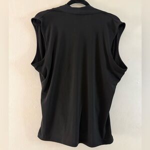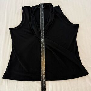 Elegant and flattering Banana Republic draped surplice sleeveless blouse in black. Soft stretch fabric with beautiful front crossover drape and relaxed fit — perfect for work, office, business casual, or evening wear.