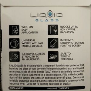 Liquid Glass is an advanced technology, invisible, wipe-on screen protector that bonds to the glass of your device offering enhanced scratch, moisture, and impact resistance. Made of silica dioxide (Si02) Liquid Glass is essentially microscopic particles of glass suspended in a liquid solution. Easy, wipe-on application makes the application a breeze. Liquid Glass adds an additional extremely thin layer of glass that is highly scratch & shatter resistant and increases the glass' strength to 9 H hardness level. Liquid Glass screen protector protects your device's screen against regular scratches that may happen with regular use. It will NOT make your screen completely shatter-proof or scratch-proof. It will only improve your glass' strength and increase the scratch resistance. Your screen can still get scratched or broken with a liquid glass screen protector (it does not fix or repair exiting crack or scratches).