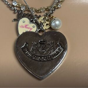 This gotta-have vintage Juicy Couture Everything Juicy 3 strand necklace features the classic Juicy Couture engraved heart “Let Them Eat Couture”, a “Love” chain and a chain with crystals chain. Two gold and 1 silver strands. Add in a pearl and heart and you’ve got a classic Juicy look!