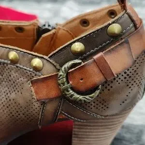 Laser cut leather upper. Inside zip closure. Round toe. Synthetic lining. Cushioned footbed. Approx. 2.25" shaft height. 2.5" stacked block heel. Synthetic outsole.