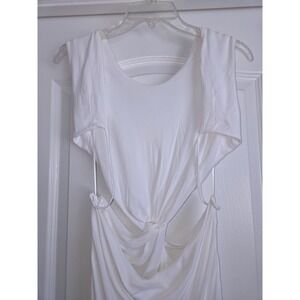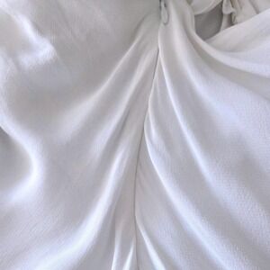 New with tags, Alberta Ferretti sleeveless maxi dress crafted from fluid white viscose with a sophisticated matte finish. This elegant gown features a striking front twist detail that creates daring side cutouts and a draped, floor-length silhouette, with side zipper closure. The minimalist design is balanced by the intricate gathering at the waist, offering a Grecian-inspired aesthetic perfect for high-end summer events or formal occasions. Made in Italy, this piece showcases the brand's signature focus on feminine draping and effortless luxury. Size 4, measurements lying flat pit to pit 15", waist 16", and length 64", Retail $245