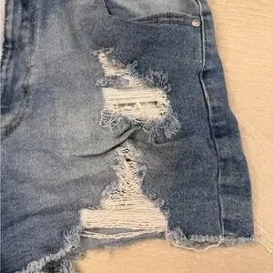 Stylish jean shorts with a unique two-tone design. Features a light and dark blue contrast. Distressed detailing adds a trendy touch. Preowned.