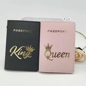 Set of two passport holders. One pink with 'Queen' in gold. One black with 'King' in gold.