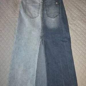Stylish two-tone denim skirt perfect for casual outings. Features a unique design with contrasting shades of blue. A must-have for any wardrobe.