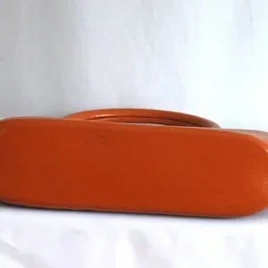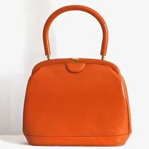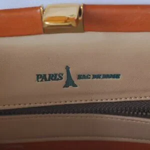 This textured leather, Paris Sac De Dame 1960's hand bag is a classic. The frame and top handle are covered in a smooth cowhide leather. It has a gold tone clasp on the top, opening up to a light tan leather interior. One side has one zipped, and one open pocket. The other side has one open pocket. The label is printed inside with an image of the Eiffel tower, and Sac De Dame. It measures 12" wide x 9 1/2" high with a handle drop of 5". It is in excellent condition, inside and out.