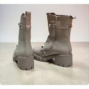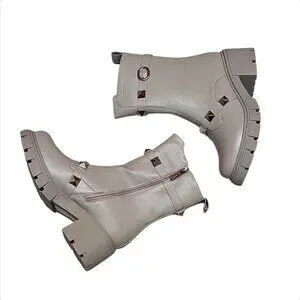 Add a touch of bold elegance to your outfit with these gray studded combat-style boots. Featuring a chunky block heel and side zipper closure for easy wear.