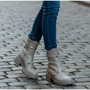 Studded Gray Combat-Style Ankle Boots With Chunky Block Heel And Side Zipper Clo