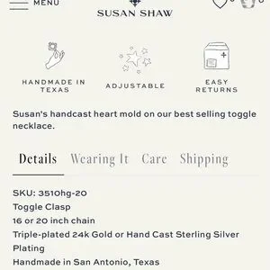 Design: The necklace features a signature hand-cast heart mold originally crafted by Susan Shaw in 2002.