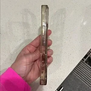 Clear phone case with white floral design. Gold accents add elegance. Perfect for style and protection.