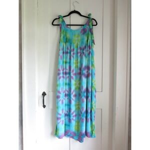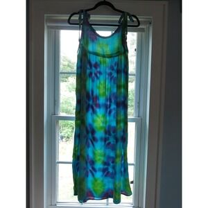 Blue and purple tie dye rayon sundress in great shape with one small hole at the hem, as pictured. Adjustable tie shoulder straps and on seam pockets. Free size