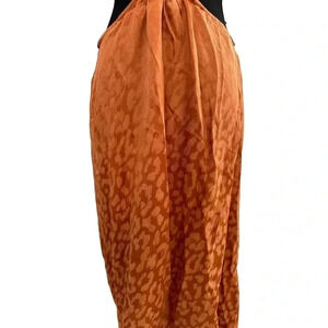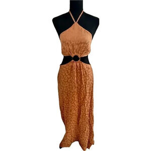Leopard printed halter maxi dress with ring at front waist. Halter ties at back. Zip closure at back waist.
