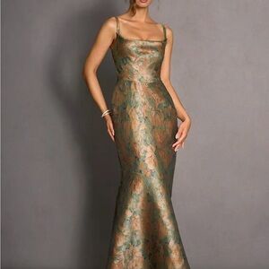 Shimmering green maxi dress with floral pattern. Features a fitted bodice and flowing skirt. Ideal for elegant occasions.