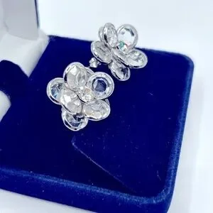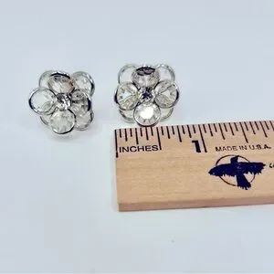 Beautiful vintage pierced earrings that are flower petals made of faceted glass and a center crystal. The petals are trimmed in silver tone metal. No tarnish and in excellent condition. These gorgeous pierced earrings have been in storage since the 1990’s. They look brand new. The glass petals are bezel set with shiny silver metal. The crystal in center is prong set. There are no stamps on back but the crafting is very good. Well made earrings and gorgeous! These would make a nice gift too. They’re approx 3/4” wide. Wear for every occasion and for every season!