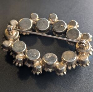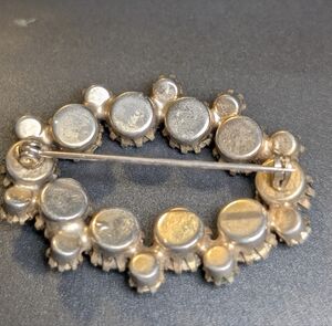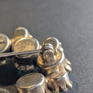 Striking vintage rhinestone brooch featuring luminous green faceted stones with iridescent Aurora Borealis finish that flashes blue, teal, and golden tones in the light. This mid-century style oval wreath design showcases prong-set rhinestones in graduated sizes with open-back construction, allowing maximum brilliance and depth. The silver-tone setting enhances the cool undertones while the AB coating creates dimensional shimmer with every movement. A true statement piece perfect for cottagecore styling, holiday wear, formal events, or adding vintage glamour to blazers, coats, and knitwear. No visible maker’s mark. Secure rollover clasp. A beautiful example of classic mid-century costume jewelry craftsmanship. I cannot confirm this is a Weiss brooch however it does have many of the quality markings of one. Just not the stamp and some of the early pieces did not have stamps.