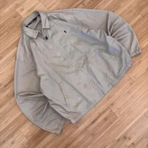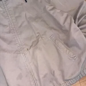 Vintage Polo Ralph Lauren beige Harrington style full zip jacket tagged size XL with embroidered navy pony logo on chest. Lightweight cotton shell ideal for layering with a relaxed boxy 90s fit great for streetwear or everyday outfits. Neutral tan color pairs easily with jeans or cargos. Pre-owned with visible wear and light staining on front and sleeves from normal use, zipper works and structure is solid. Elastic cuffs and hem intact. Classic Polo essential for vintage and Y2K fits. Refer to all measurements pictured for most accurate sizing and fit.