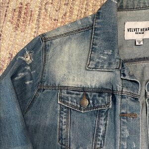 Velvet heart size m denim jacket. Cropped/boxy fit. Distressed look! Great condition. Purchased as is. Measures approx 20 inches from shoulder to hem.