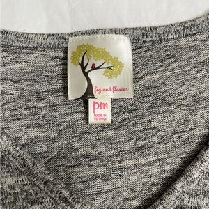 Beautiful Fig & Flower boho blouse in soft gray marled knit featuring vibrant floral embroidery on the sleeves and cuffs. Designed with a flattering V-neck and front tie hem for an easy, flowy silhouette.