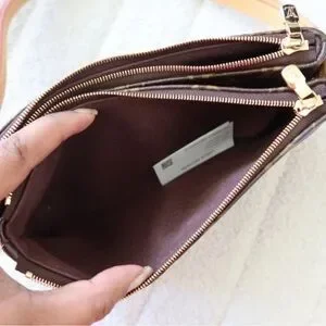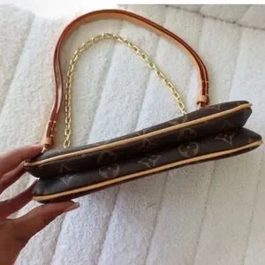 Stylish crossbody bag with iconic monogram pattern. Features a gold chain and adjustable strap. Perfect for versatile wear.