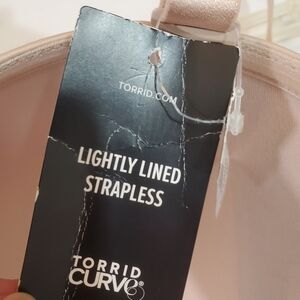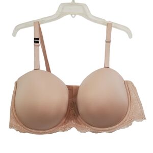 This is the Lightly Lined Strapless Multi-way bra from Torrid Curve. Nude / beige neutral color with lace accents. Has an Underwire. Convertible and removable straps. Lightly Lined level of padding. Back adjustable hook/eye closure. Adjustable straps.